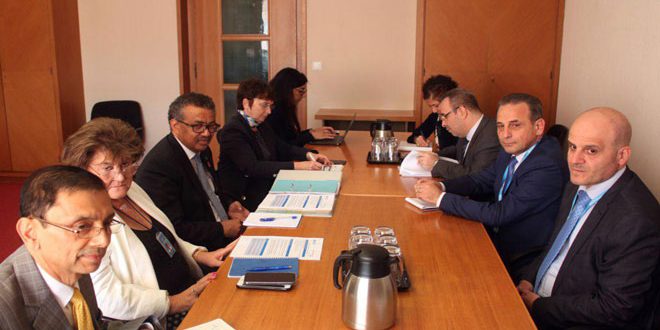 بحث وزير الصحة الدكتور نزار يازجي مع مدير عام منظمة الصحة العالمية الدكتور تيدروس أدهانوم غيبرييسوس جهود الوزارة للوصول إلى التغطية الطبية الشاملة وسط التحديات المتمثلة بخروج مشاف ومراكز صحية من الخدمة جراء استهداف الإرهابيين لها والإجراءات الاقتصادية القسرية أحادية الجانب على سورية.