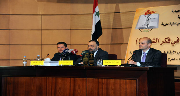 وفي كلمة له خلال ندوة “فقه الأزمة وأثره في فكر الشباب” التي أقامها الاتحاد الوطني لطلبة سورية “فرع معهد الشام العالي للعلوم الشرعية” بمناسبة الذكرى الـ44 للحركة التصحيحية المجيدة على مدرج جامعة دمشق اليوم رأى الوزير السيد ان أدعياء الدين والمغالين والمتطرفين عملوا على تشويه حقيقة الدين الإسلامي المعتدل الذي تتسم به بلاد الشام عبر تحالف واضح وعلني بين الوهابية التكفيرية والصهيونية العالمية لتدمير سورية واستهدافها حضارة وشعبا.