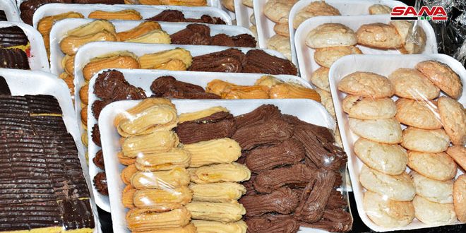 كعك العيد والكرابيج وأقراص بعجوة والمعمول بالجوز المزين بالسكر الأبيض الناعم تتصدر قائمة الحلويات التي تقدمها العائلات على موائد الضيافة ولا سيما في ريف اللاذقية وتتحول المنازل إلى خلايا نحل تعج بالحيوية إذ تنهمك السيدات بإعداد شتى أصناف الحلويات التقليدية.