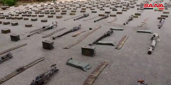 وعثرت عناصر من قوى الأمن الداخلي بالتعاون مع الأهالي في دير الزور في الحادي عشر من الشهر الماضي على كميات كبيرة من الأسلحة والقذائف في محيط قلعة الرحبة غرب مدينة الميادين من مخلفات إرهابيي تنظيم “داعش” طمروها في مخابئ تحت الأرض قبيل اندحارهم بفضل بطولات الجيش العربي السوري.