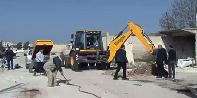 وقال العمري: إن آليات مديرية الخدمات الفنية ومجلس المدينة عملت على إزالة الأنقاض والسواتر الترابية وتم اطلاق حملات تنظيف داخل المنطقة وتعمل الآن شركة الكهرباء على تأمين التيار الكهربائي وإعادة مد الخطوط وتركيب العدادات.
