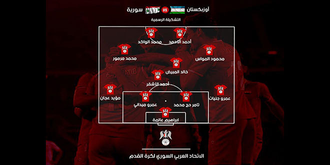أعلن الجهاز الفني والتدريبي لمنتخب سورية بكرة القدم للرجال التشكيلة التي ستخوض المباراة الدولية الودية مع نظيره الأوزبكي اليوم في الملعب الوطني في العاصمة طشقند.