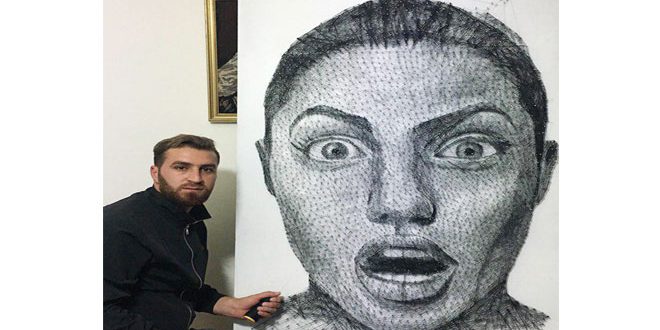 استطاع الرسام الشاب بكر عبد الرزاق أن يتمرد على الريشة والألوان في رسم البورتريه فاستعان بالخيوط والمسامير وحولها إلى لوحة فنية كاملة لها قدرة على خلق حالة من الإدهاش ببراعة رسمها وتقنيتها العالية.