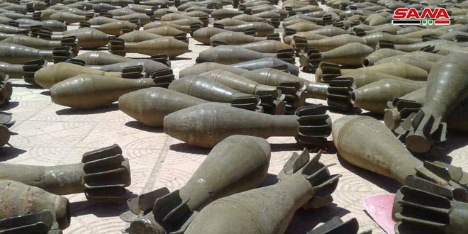 خلال عمليات المتابعة والتحري وفي إطار تمشيط المناطق المحررة من الإرهاب حفاظا على حياة المدنيين وعودة آمنة لهم إلى قراهم ومنازلهم عثرت الجهات المختصة ووحدات من الجيش العربي السوري بدلالة عدد من الأهالي على مستودعات للذخائر والمواد شديدة الانفجار من مخلفات إرهابيي داعش في ريفي الرقة الجنوبي ودير الزور الشرقي.