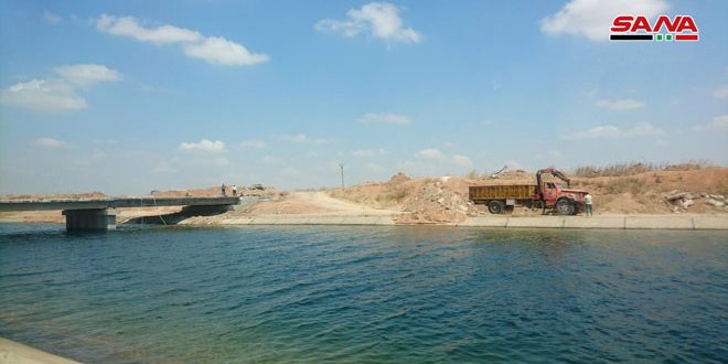 وفيما يتعلق بإعادة تأهيل الجسور المائية أشار إلى أن عدد الجسور المائية المخربة جراء الإرهاب بلغ 15 جسرا وهي موزعة على كامل طول القناة الرئيسية لمشروع (مسكنة غرب) والبالغ 75 كم من محطة البابيري على بحيرة الأسد وحتى جسر الكابلات شرق حلب وتم وضع أولويات لتنفيذ عدد من الجسور خلال فترة توقف الري وتم الانتهاء من تنفيذ 3 جسور رئيسية نظرا لأهميتها ومنها جسر الكابلات نهاية القناة الرئيسية في منطقة السفيرة وجسر بلاط على نفس القناة لنقل المحاصيل الزراعية من الحبوب إلى مراكز الاستلام والمطاحن وجسر جب غبشة الواقع على تقاطع القناة الرئيسية مع الطريق الدولي حلب- الرقة كما تم تركيب خمس عبارات بشكل إسعافي من أجل فتح مياه الري وتوزيعها على مناطق جب غبشة ورسم العبود ورسم الامام وجب ماضي وتل المعز.