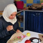 مقدمة الدعم النفسي والاجتماعي في المركز ساندي نصر الدين أشارت إلى نجاح كيالي في الجمع بين الخياطة والأعمال اليدوية لتقديم منتجات مميزة.