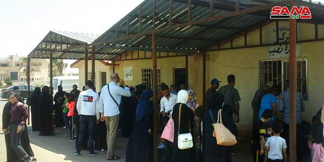 العقيد مازن غندور رئيس مركز هجرة نصيب أشار في تصريح لمراسل سانا إلى أن المعبر استقبل اليوم عددا من العائلات المهجرة إلى مخيم الأزرق في الأردن مبينا أن العاملين في المعبر يقومون بتأمين ما يلزم من حافلات لنقلهم مع أطفالهم إلى أقرب نقطة لمدنهم وقراهم وسيارات شحن لنقل أمتعتهم.