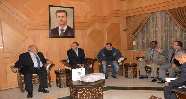 بحث محافظ حلب الدكتور محمد مروان علبي مع سيمون سكورنو منسق شؤون الإعلام في مكتب اللجنة الدولية للصليب الأحمر بدمشق اليوم واقع العمل الإغاثي والإنساني وإنشاء مركز من قبل اللجنة لتصنيع وتركيب الأطراف الصناعية في حلب.