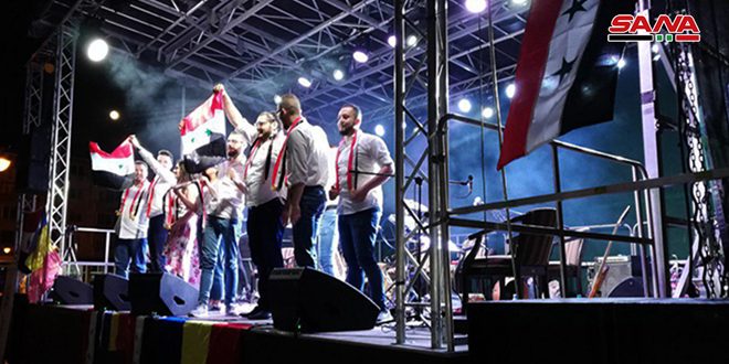 وأدت الفرقة خلال الحفل أغاني وطنية مثل “بكتب اسمك يا بلادي” و “زينوا المرجة” و “تعلا وتتعمر يا دار” إضافة إلى أشهر الأغاني التراثية للمحافظات السورية في الساحة التي ازدانت بأعلام سوريّة إلى جانب أعلام رومانيا.