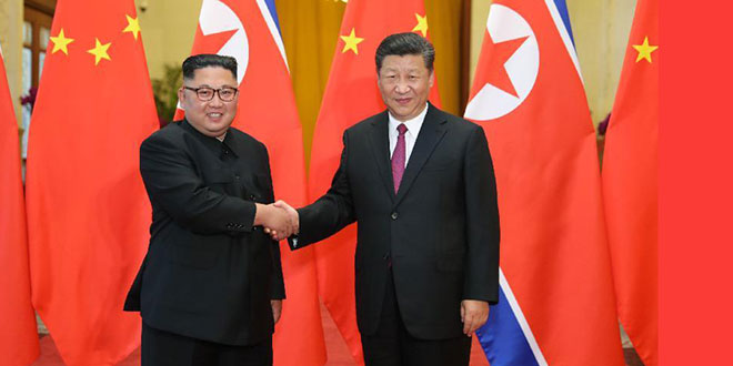 بحث الرئيس الصيني شي جين بينغ مع رئيس كوريا الديمقراطية كيم جونغ أون في بيونغ يانغ اليوم سبل تعزيز التعاون الثنائي بين البلدين.