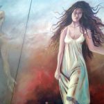 وجسدت الفنانة التشكيلية مجد مكارم بلوحتها حوارا بين الرجل والأنثى بأسلوب تعبيري وبتقنية الإكريليك مبينة أن الأنثى حاضرة في الفن وقادرة على التعبير عن نفسها من خلال الذات المتطلعة إلى التحرر والانطلاق.