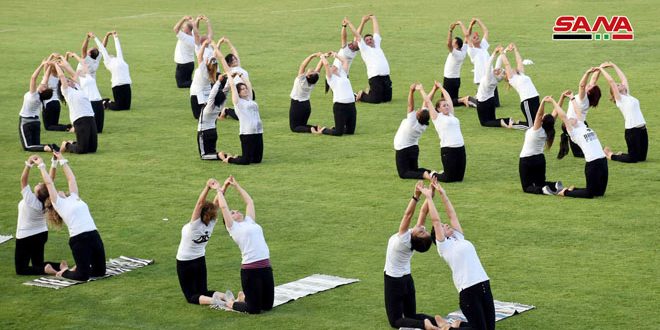 وقدم مجموعة من المتدربين من محافظات حمص وحلب واللاذقية عروضا رياضية ولوحات فنية تجسد القيمة الروحية والجسدية لرياضة اليوغا .