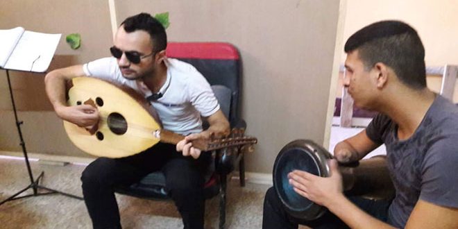 في صورة تبعث على الأمل بالحياة يتحدى الشابان الجريحان باسل الخضر ومحمود الحسن إصابتيهما من خلال إتقانهما العزف على العود والإيقاع ضمن فرقة “صدى المحبة” التابعة لجمعية “صامدون رغم الجراح” في حمص ليؤكدا بالفعل لا بالقول أنهما قادران على العطاء.