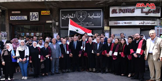 تضامنا مع الشعب الفلسطيني وقضيته العادلة نظم المحامون السوريون اليوم وقفة احتجاجية أمام نقابة المحامين في دمشق تنديدا بـ “ورشة البحرين الاقتصادية” التي دعت إليها الإدارة الأمريكية بهدف تمرير ما يسمى “صفقة القرن” الرامية إلى تصفية القضية الفلسطينية وإنهاء حقوق الشعب الفلسطيني.
