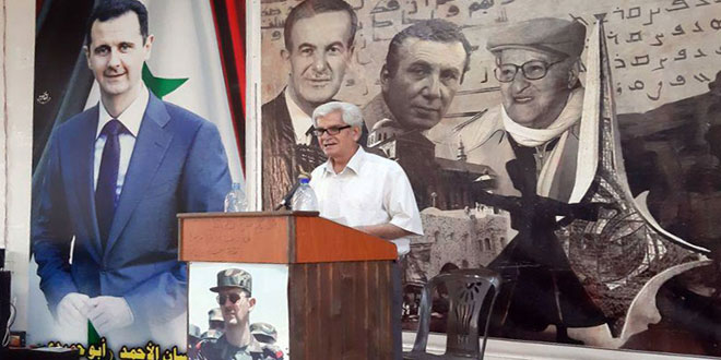 وألقى الشاعر اسماعيل عمار زجليات وطنية باللهجة المحكية “إلى جندي” أرسل عبرها تحية حب واعتزاز لصمود بواسل الجيش العربي السوري في حربهم على الإرهاب كما خاطب البحر بزجلية “يا بحر” وكأنه صديق يطالبه بأن يرجع سفينة نوح لتأخذ معها ما لاقاه السوريون من مصاعب.