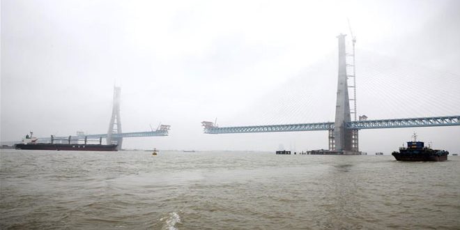 أعلن مهندسون صينيون اكتمال بناء ثاني برج يبلغ ارتفاعه 330 مترا لأكبر جسر مدعوم بكابلات في العالم بمقاطعة جيانغسو شرق البلاد.