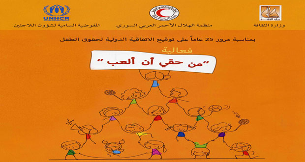 تقيم وزارة الثقافة بالتعاون مع منظمة الهلال الأحمر العربي السوري والمفوضية السامية لشؤون اللاجئين فعالية بعنوان “من حقي أن ألعب” طيلة يومي غد الجمعة وبعد غد السبت من الحادية عشرة صباحا حتى الرابعة عصرا في الصالة المغلقة بملعب الجلاء وذلك بمناسبة مرور خمسة وعشرين عاما على توقيع الاتفاقية الدولية لحقوق الطفل.