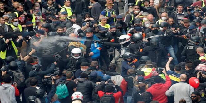 ونفذ محتجو “السترات الصفراء” مظاهرة أمس في العاصمة الفرنسية باريس بعد نحو ثمانية أشهر من بدء هذا الحراك احتجاجاً على سوء الأوضاع الاقتصادية والاجتماعية بينما قمعتهم قوات الأمن باستخدام الغاز المسيل للدموع.