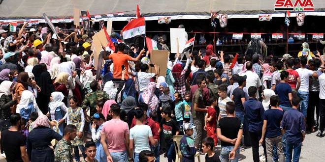 المحتفلون الذين تجمعوا في ساحة المدينة حاملين العلم الوطني وصور السيد الرئيس بشار الأسد رددوا أغاني وطنية وشعارات تمجد بطولات الجيش العربي السوري في محاربة الإرهاب في حين قدمت مجموعة من أطفال المدينة لوحة فنية راقصة وسط تصفيق الحاضرين.