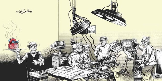 وسلط الرسم الفائز الضوء على الرعاية الصحية بأسلوب ساخر تراجيدي عكس غاية الكاريكاتور التنويرية في ظل انتشار ما يسمى “تجارة الأعضاء عالميا”.