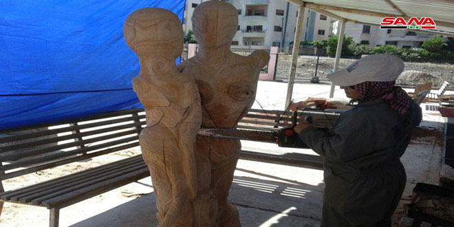 منحوتات متنوعة بخامة الخشب قدمها 15 فناناً من مختلف المحافظات ضمن ملتقى النحت القطري الثالث على الخشب في السويداء الذي حمل عنوان (الفن لغة الجمال).