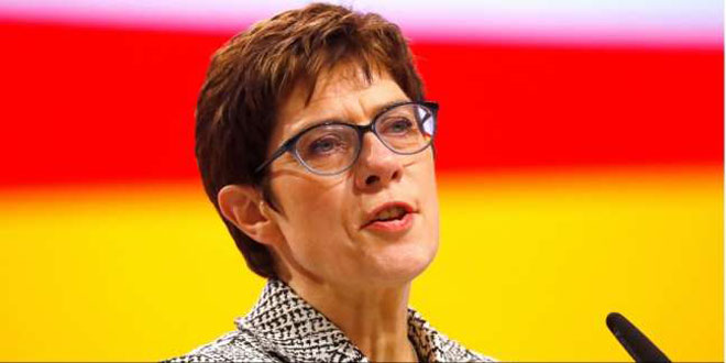 أعلنت وزيرة الدفاع الألمانية الجديدة أنغريت كرامب كارينباور أن ألمانيا أعطت تعهداً رسمياً وواضحاً بزيادة إنفاقها الدفاعي ما يمثل رضوخاً من قبل حكومة المستشارة انجيلا ميركل لابتزازات الرئيس الأميركي دونالد ترامب الذي طالب دول الناتو بإنفاق ما يعادل 2 بالمئة من إجمالي ناتجها المحلي على الدفاع.