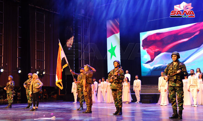 ومر العرض على أهم منجزات سورية الحديثة من إقامة المصانع والمشافي والمطارات والجامعات والرياضة ومشاهد من حرب تشرين التحريرية ورفع العلم السوري في سماء القنيطرة المحررة وصولاً إلى معارك الجيش العربي السوري وانتصاراته في مواجهة الإرهاب.