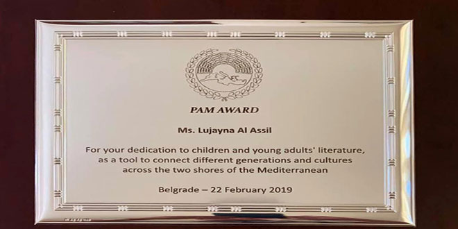 حصلت الفنانة التشكيلية السورية لجينة الأصيل على جائزة “بام” التي تمنحها الجمعية البرلمانية للبحر الأبيض المتوسط في مدينة بلغراد بصربيا.