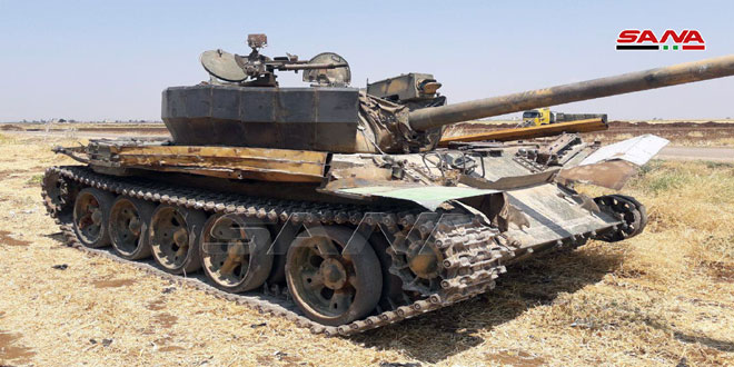 مدرعات وعربات وأسلحة وذخائر من مخلفات الإرهابيين في بلدتي تل ملح والجبين بريف حماة الشمالي الغربي بعد تطهيرهما من الإرهاب