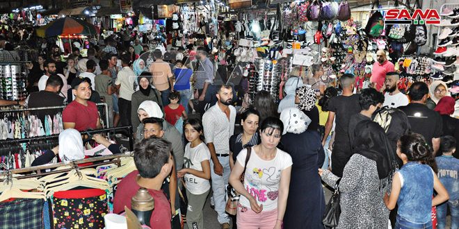 كاميرا سانا رصدت جانباً من حركة الأسواق حيث يتحدث سمير الأحمد لمراسلة سانا عن طقوس عيد الأضحى وفي مقدمتها زيارة الأهل والأقارب وتبادل المعايدات والتهنئة والاجتماع في منزل العائلة على مائدة واحدة في أول أيام العيد بينما ترنو عيون الأطفال إلى “العيدية” من الأهل والأقارب لشراء الألعاب والسكاكر والمثلجات والمقبلات من الباعة المتجولين وزيارة مدن الملاهي والحدائق العامة حيث المراجيح والقلابات والعربات التي تشبه القطار للاستمتاع بأجواء العيد.
