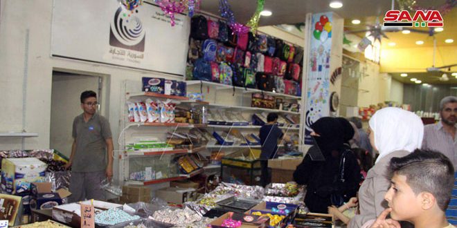 وأوضح مدير فرع المؤسسة في حلب عبد الحميد مسلم بتصريح لمراسلة سانا أنه تم تجهيز جميع الصالات بكل المواد ومستلزمات العيد من سكاكر وحلويات إضافة إلى التشكيلة السلعية الأساسية التي تؤمن حاجات المواطنين لافتا إلى أن الصالات تنتشر على نطاق واسع ويبلغ عددها نحو 62 صالة ومركز بيع في المدينة والريف وهناك خطة مستقبلية للتوسع بـ 15 موقعا حيث تقوم المؤسسة بالبيع بالتقسيط للعاملين في الدولة لتأمين مستلزمات الأعياد كما أن هناك خطة لافتتاح مهرجان القرطاسية استعدادا لبدء العام الدراسي.