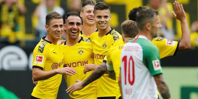 سحق بروسيا دورتموند ضيفه أوغسبورغ 5-1 في الجولة الافتتاحية لدوري الدرجة الأولى الألماني لكرة القدم اليوم ليرسل تحذيراً للجميع بعد تعثر بايرن ميونيخ بطل الدوري الماضي أمس.