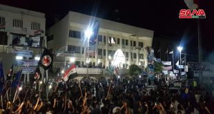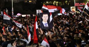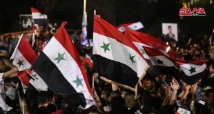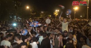 دمشق-سانا شهدت ساحة الأمويين بدمشق تجمعاً جماهيرياً كبيراً احتفالاً بإنجاز الاستحقاق الدستوري وفوز الدكتور بشار الأسد بمنصب رئيس الجمهورية تخلله عروض فنية وغنائية وألعاب نارية. المواطنون ملؤوا الساحة ومداخلها حاملين الأعلام وهواتفهم لتوثيق لحظات الفرح والاحتفال وإعلان نتائج الاستحقاق الذي …