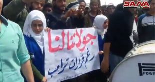 محافظات-سانا واصلت الفعاليات الشعبية وقفاتها الاحتجاجية اليوم على إعلان الرئيس الأمريكي دونالد ترامب حول الجولان العربي السوري المحتل. ففي القلمون بريف دمشق احتشد أهالي القرى والبلدات التابعة للمنطقة في مدينة دير عطية، حاملين لافتات كتب عليها “منحبك يا جولان وستعود …