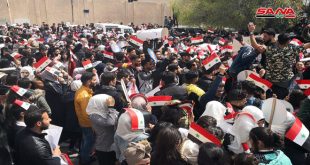 محافظات-سانا واصلت الفعاليات الرسمية والشعبية اليوم وقفاتها الاحتجاجية تنديداً بإعلان الرئيس الأمريكي دونالد ترامب حول الجولان العربي السوري المحتل. ففي دمشق احتشد الآلاف من طلاب وأساتذة جامعة دمشق أمام مبنى الأمم المتحدة احتجاجا على إعلان ترامب، واستنكر المشاركون في بيان سلمه …