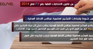 دمشق-سانا ذكرت وزارة الإدارة المحلية والبيئة اليوم بالشروط الواجب توافرها في الراغبين بالترشح لعضوية مجالس الإدارة المحلية حسب التعليمات التنفيذية لقانون الانتخابات العامة. وبينت الوزارة أن المرشح يجب أن يكون متمتعا بجنسية الجمهورية العربية السورية منذ عشر سنوات على الأقل …