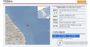 سيئول- سانا ضربت هزة أرضية بقوة 4.5 درجات على مقياس ريختر قبالة مدينة دونغهيه الواقعة على الساحل