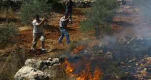 القدس المحتلة-سانا أضرم مستوطنون إسرائيليون اليوم النار بأراضي في قرية اللبن الشرقية جنوب مدينة نابلس شمال الضفة الغربية.