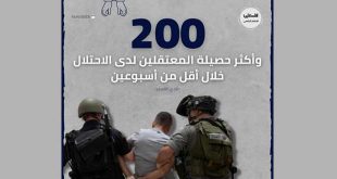 القدس المحتلة-سانا أعلن نادي الأسير الفلسطيني أن قوات الاحتلال الإسرائيلي اعتقلت أكثر من 200 فلسطيني