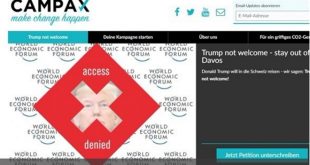 جنيف-سانا أطلقت منظمة كامباكس السويسرية للحملات والتعبئة عريضة الكترونية ترمي للحؤول دون حضور الرئيس الامريكي دونالد ترامب منتدى دافوس الاقتصادي العالمي. ونقلت “فرانس برس” عن المنظمة التي عنونت العريضة “ترامب.. لست مرحبا بك.. ابق بعيدا عن دافوس” قولها “يجب علينا …