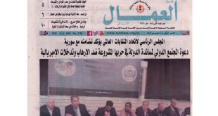 المزيدإعلان اتحاد النقابات العالمي تضامنه مع سورية يتصدر غلاف (كفاح العمال)