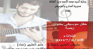 دمشق-سانا يطلق الموسيقي الشاب سليمان الشلبي ألبومه الموسيقي الأول ضمن حفل غنائي وموسيقي بمرافقة شقيقته المغنية الشابة مانو وعدد من الموسيقيين عند السادسة من مساء الثلاثاء القادم وذلك على خشبة مسرح الحمراء بدمشق. وسيتضمن برنامج الحفل عدة مقطوعات موسيقية ألفها …