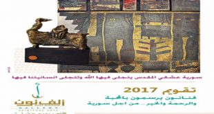 دمشق-سانا أطلقت صالة “ألف نون” للفنون والروحانيات مشروعها الجديد بعنوان “لوحة وجملة” بهدف دعم المجتمع الأهلي المحلي من خلال إصدار تقويم. ويشارك في المشروع مجموعة من الفنانين التشكيليين السوريين من خلال لوحاتهم مدونة عليها عبارات تدور حول “المحبة والرحمة والخير …