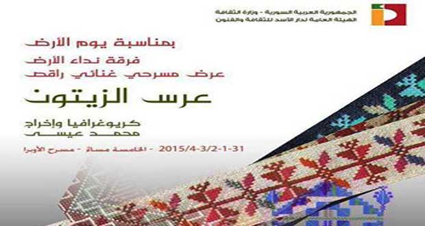 دمشق-سانا بمناسبة يوم الأرض تقدم فرقة نداء الأرض الفلسطينية عرضا مسرحيا غنائيا راقصا بعنوان عرس الزيتون على خشبة مسرح دار الأوبرا عند الساعة الخامسة من مساء أيام الثلاثاء والأربعاء والخميس القادمة. تدور فكرة العمل حول قرية فلسطينية تلتحم فيها أفراح …