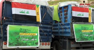حلب-سانا وصلت إلى حلب قافلة مساعدات عراقية اليوم، نظمتها كتائب حزب الله في العراق، تضم 20 شاحنة محملة بالمواد الإغاثية