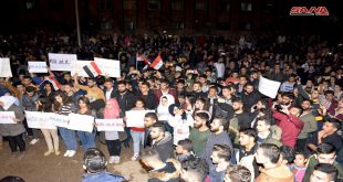 حلب-سانا نظم فرع الاتحاد الوطني لطلبة سورية في جامعة حلب مساء اليوم وقفة احتجاجية في الساحة الرئيسية للمدينة الجامعية رفضا للوجود الأمريكي غير الشرعي على الأراضي السورية. ورفع المشاركون في الوقفة الاحتجاجية لافتات تندد بوجود القوات الأمريكية وجميع القوات الأجنبية …