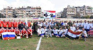 حلب-سانا بمناسبة الذكرى المئوية لتأسيس الجيش الروسي أقيم احتفال رياضي أمس على أرض ملعب رعاية الشباب في حلب تضمن مباراة ودية بكرة القدم بين فريق الجيش العربي السوري وفريق الجيش الروسي اضافة الى مسابقة جري وأخرى في شد الحبل. وبين محافظ …