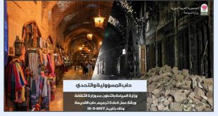 دمشق-سانا في إطار توحيد الرؤى لمرحلة إعادة ترميم وإعمار مدينة حلب القديمة وفق تصورات وخطط عمل مشتركة بين مختلف القطاعات تعقد وزارتا السياحة والثقافة بالتعاون مع منظمة الأمم المتحدة للتربية والثقافة والعلوم ” اليونيسكو ” غدا ورشة عمل ” المسؤولية …