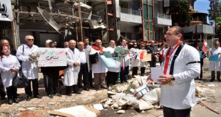 حلب – سانا نفذ أطباء حلب اليوم وقفة تضامنية أمام مشفى ضبيط بحي المحافظة عبروا من خلالها عن استنكارهم للجرائم التي ترتكبها التنظيمات الإرهابية المسلحة بحق حلب وأهلها ومنها استهداف مشفى ضبيط بالقذائف الصاروخية ما أدى لارتقاء أربعة شهداء بينهم …