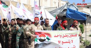 دير الزور-سانا شهد مخيم النيرب في حلب اليوم مسيرة حاشدة ضمن فعاليات يوم القدس العالمي ندد المشاركون فيها بالاعتداءات الإسرائيلية على الشعب الفلسطيني